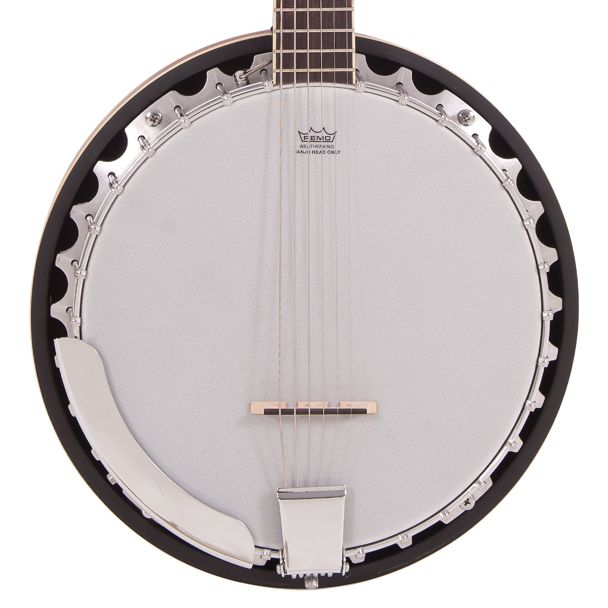 This is a mahogany 6-string guitar banjo with resonator. The VPBG26 features a Vintage guitar-style headstock, enclosed Grover-style machine heads and a semi-matt finish, which bring a quality touch to this versatile instrument. It's absolutely ideal for the guitar player who wants to access banjo style tones.