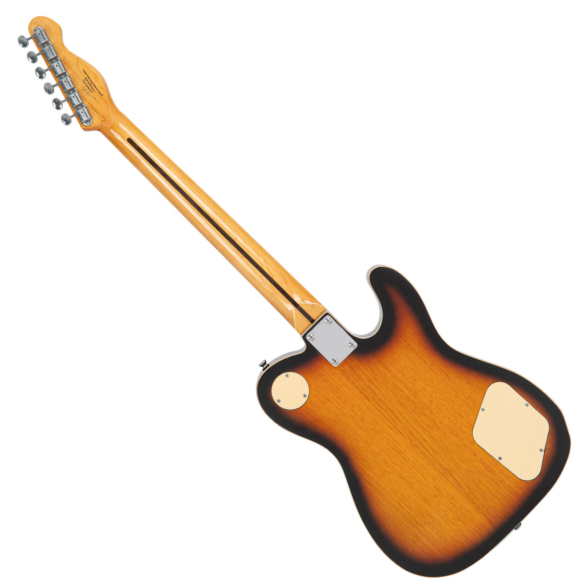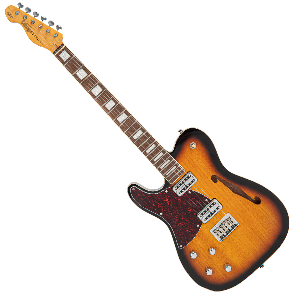 With its left-handed single cutaway, okoume chambered body, the new Vintage REVO Midline Hardtail fitted out with a pair of Alan Entwistle Nashville Classic ND double coils, delivers far more than the classic sounds associated with thin-line guitars.