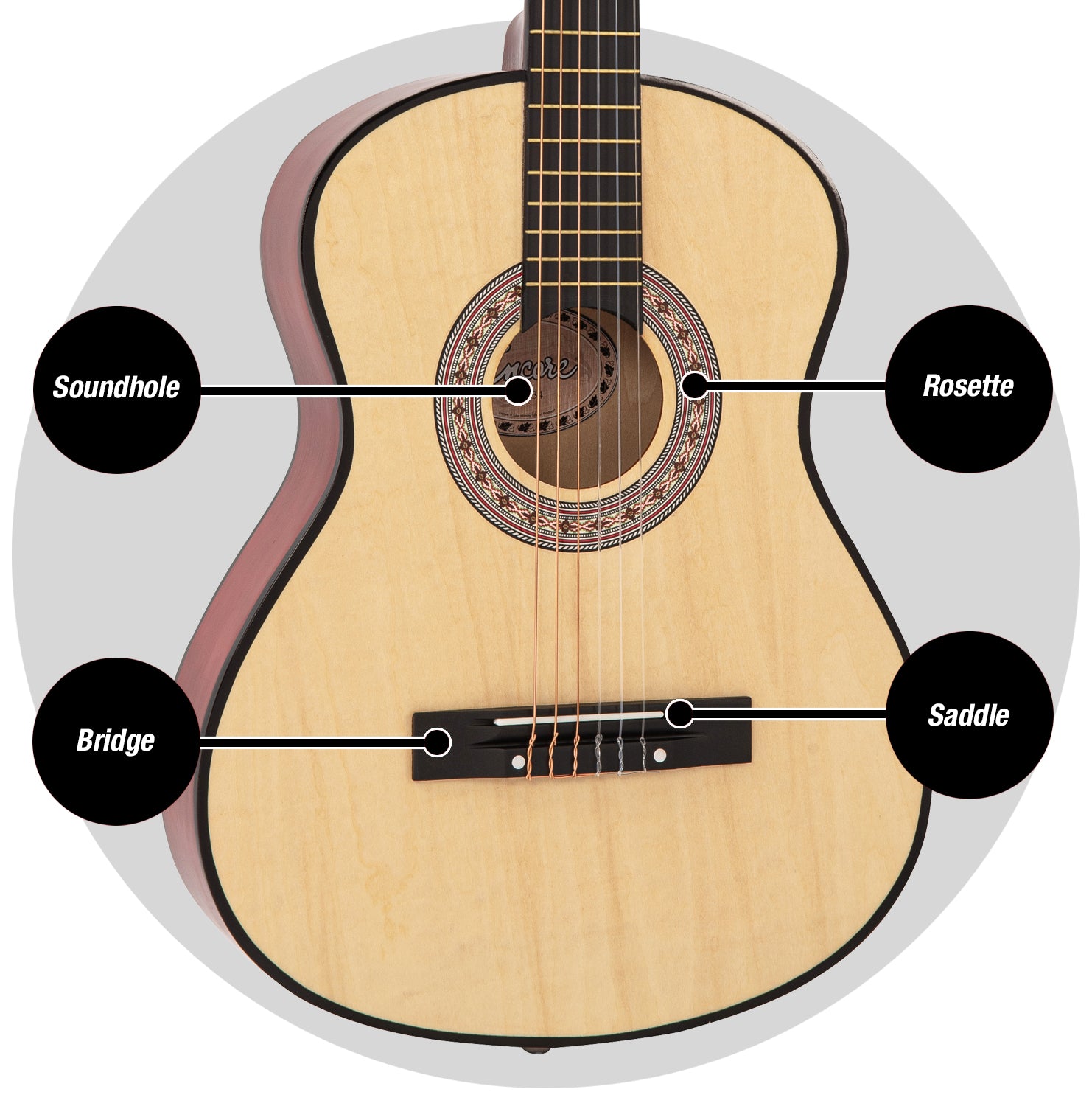 Based on traditional body designs from the 19th-century, this aspiring model finished in a striking Natural finish with a decorative soundhole rosette, effortlessly captures the Spanish classical guitar image and unmistakable sound characteristics.